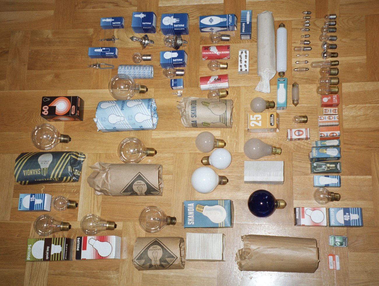 Special-glödlampor med sina originalförpackningar, vissa från (troligen) 1940-talet. Modeller som använts på tåg. Mest 24 / 72V. Koltrådslampor från sekelskiftet (monterade i tidsenliga hållare) samt en blå lampa.