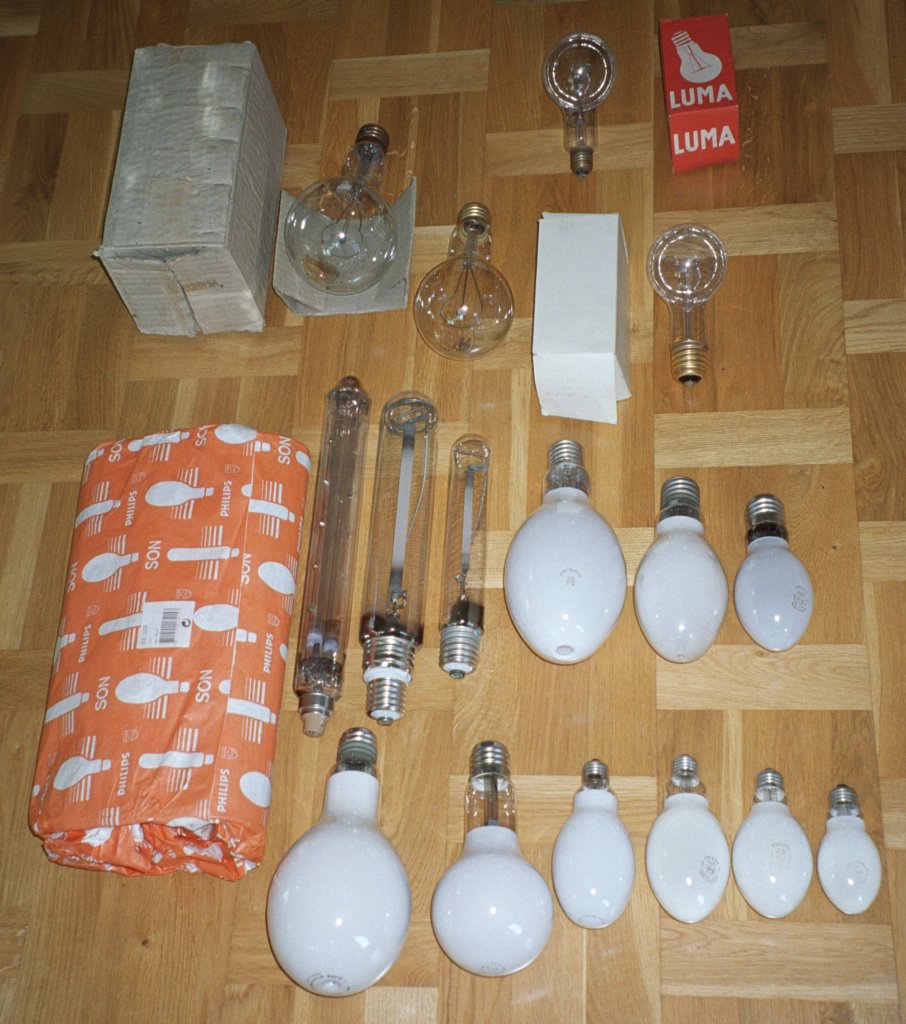 Nedre raden: Samt till vänster förpackning till en Philips SON 1000 W natriumlampa för storleksjämförelse. Saknar tyvärr lampan. |
